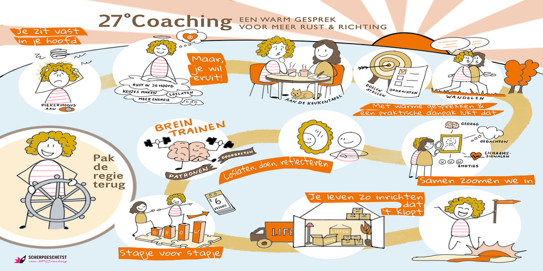 Voor een coachpraktijk in Bavel tekende ik haar coachtraject uit in één heldere praatplaat.